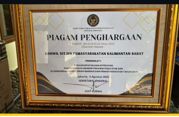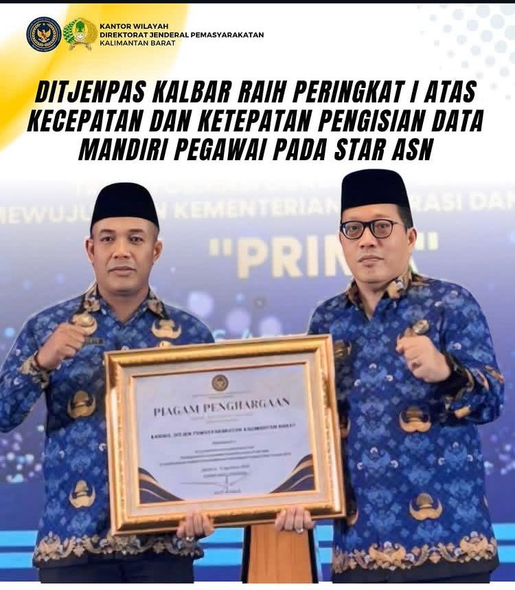 Prestasi membanggakan diraih oleh Kantor Wilayah Direktorat Jenderal Pemasyarakatan Kalimantan Barat. Dalam kegiatan Rapat Koordinasi Dukungan Manajemen Kementerian Imigrasi dan Pemasyarakatan Semester 1 Tahun 2025, Kanwil Ditjenpas Kalbar menerima piagam penghargaan atas kecepatan dan ketepatan pengisian Data Mandiri Pegawai pada aplikasi STAR ASN di lingkungan Kementerian Imigrasi dan Pemasyarakatan (06/08).